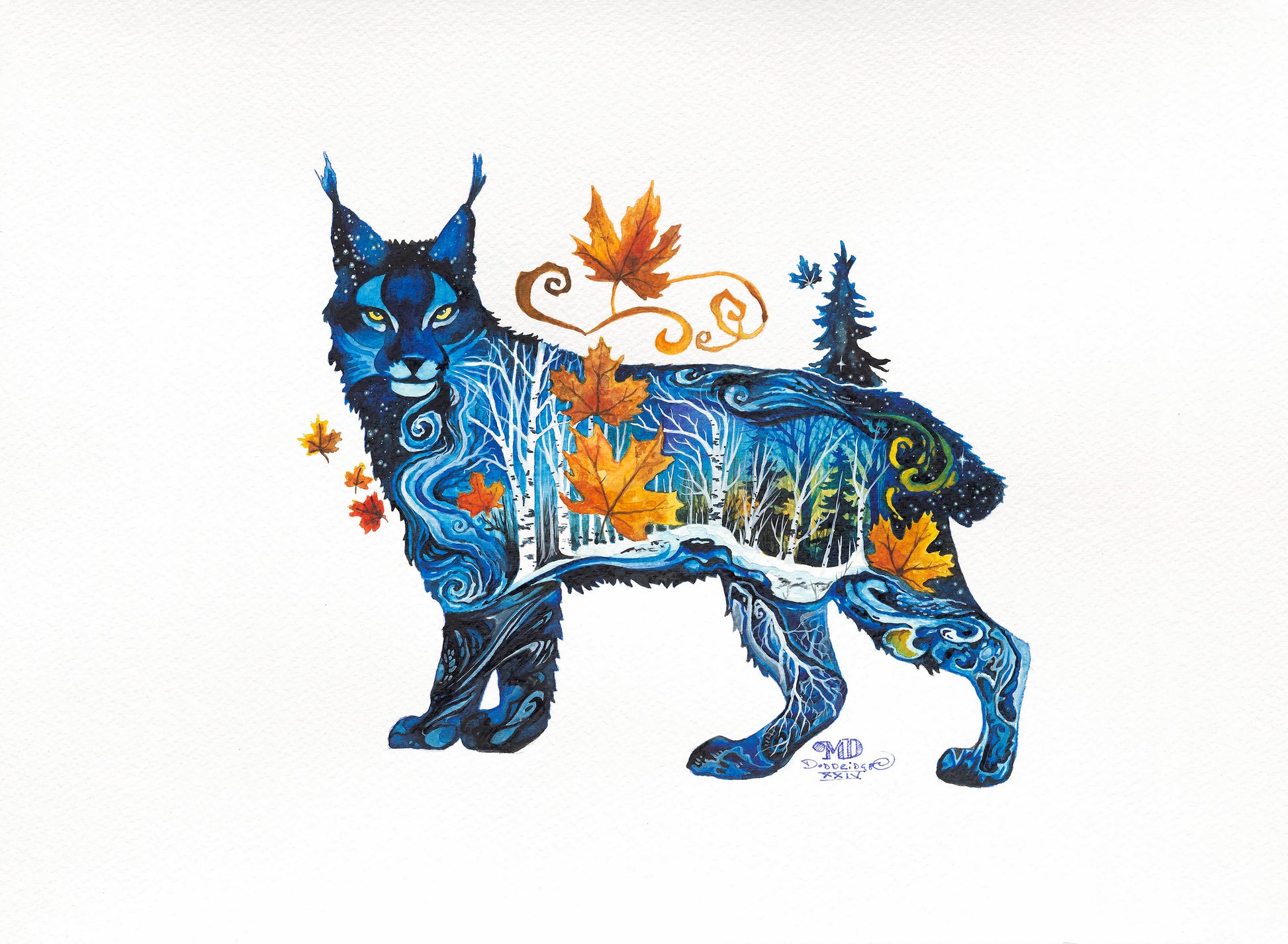 This original painting captures the iconic silhouette of a lynx filled with images of a boreal forest.