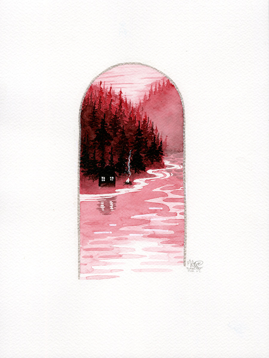Celebrate the beauty of Canada’s landscapes with this stunning painting. featuring a cottage sitting at the edge of a serene lake. The water, painted in delicate shades of pale red and rose, gently reflects the shadowy outline of the cottage, enhancing the sense of quiet isolation. The scene feels both peaceful and mysterious, as if frozen in a moment of tranquil stillness.