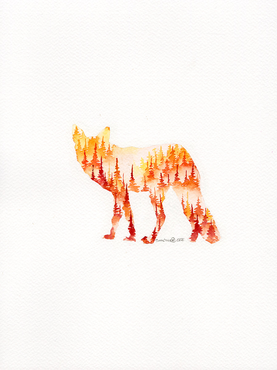 Celebrate the beauty of Canada’s wild landscapes with this stunning print. Featuring the sleek silhouette of a fox containing lush forest imagery, the work evokes the mysterious spirit of the fox. The rich textures and natural tones of the piece capture the essence of Canada’s rugged wilderness, inviting viewers to pause and reflect on the serene power of nature. Perfect for any art collection, this painting offers a timeless tribute to the country’s iconic wildlife and breathtaking landscapes.