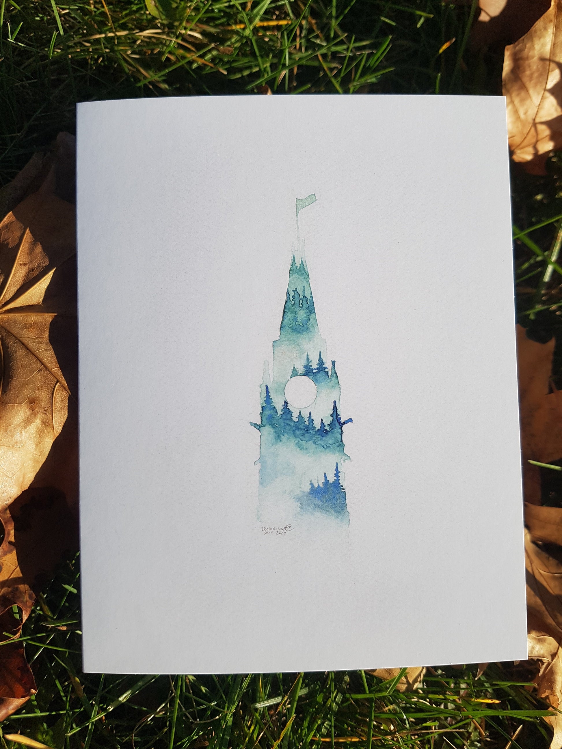 Celebrate the beauty of Canada with this stunning greeting card. Featuring the elegant silhouette of Parliament's Peace Tower, the design incorporates lush forest imagery, evoking the tranquil spirit of Canada's wilderness. Perfect for any occasion, this card offers a blank interior, allowing you to personalize your message. Whether for birthdays, thank you notes, or just a simple hello, this card is a thoughtful way to share your sentiments. Printed in Canada, it comes with a matching envelope for easy gifting.