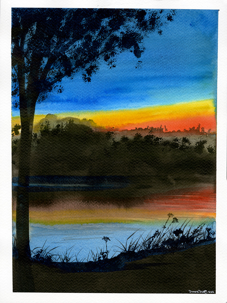 This print of the original mixed-media painting captures the tranquil beauty of a Canadian sunset. It features a breathtaking sky filled with deep orange gradually melting into soothing blue as daylight fades into night.